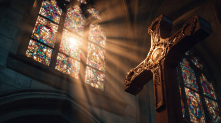Detailed image of a Crucifix at Sunrise, with the light of the sun shining through the intricate stained glass behind the cross, creating a mesmerizing effect