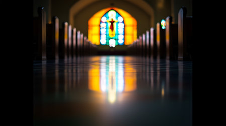 Soft light emanates from stained glass windows, casting colorful reflections inside the church. Delicate warm lighting enhances the tranquil atmosphere, inviting contemplation and reflection.