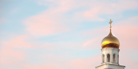 The white bell tower with the golden dome of the Orthodox Iversky female monastery in Samara, Russia. Beautiful coral sky at the golden hour of the setting sun. Copy space for inscription. Web banner.