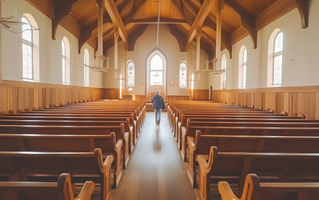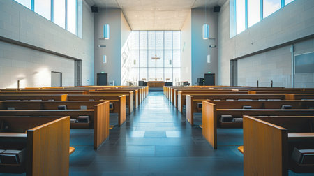 Empty church interior with wooden pews and stained glass windows illuminated by natural light
