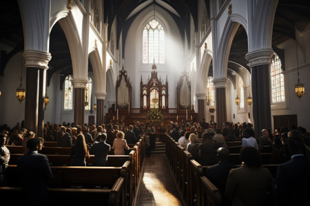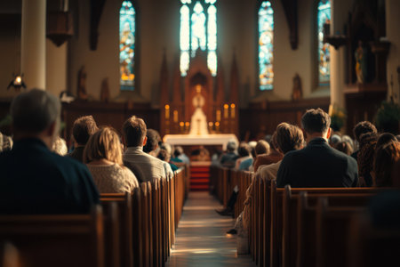 Congregation attends a church service as sunlight filters majestically through the stained glass windows, creating a serene atmosphere.