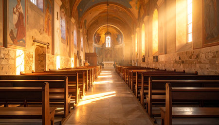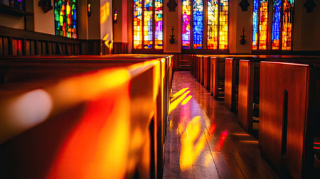 Sunlight filters through vibrant stained glass windows, illuminating wooden pews and creating a peaceful, contemplative atmosphere within the church.