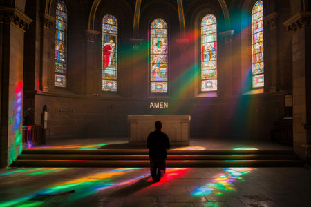 Soft rays of colored light cascade through stained glass, creating a serene atmosphere as an individual kneels in prayer at the altar.