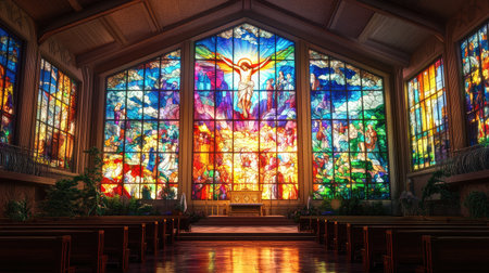 A beautiful church with stained-glass windows depicting the life of Jesus, creating a peaceful Christian atmosphere
