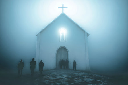 A group of individuals approaches a rustic church, enveloped in fog, with warm light streaming from within.