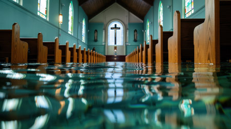 A captivating image of a church interior with water flooding the floor, creating serene reflections on the surface and evoking a sense of tranquility and abandonment.