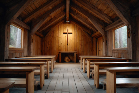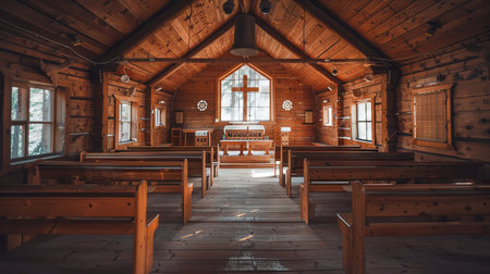 Tranquil rustic church interior with wooden architecture and sunlit ambiance.