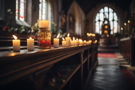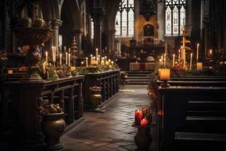 Warm candlelight illuminates the golden altar and stained glass windows of a church, creating a spiritual atmosphere. Ai generative