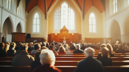 Rows of attendees sit attentively in a warm and inviting church, absorbing the speaker's message as natural light floods the interior, creating a peaceful atmosphere.