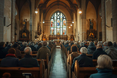 Panoramic View of Good Friday Church Service, Praying Congregation, Stained Glass Glow.