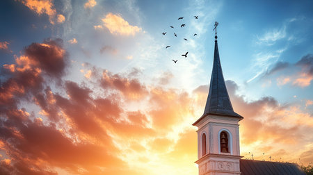 A breathtaking view of a church steeple silhouetted against a vibrant sunset sky, with birds flying in the distance. This image captures serene beauty and spirituality.