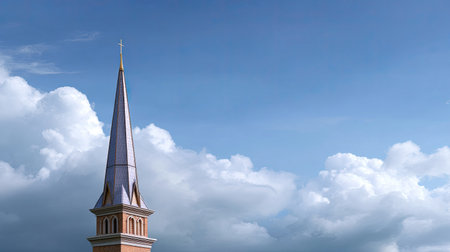 A beautiful church steeple rises against a vibrant blue sky filled with soft white clouds, conveying a sense of tranquility and spirituality in the landscape.