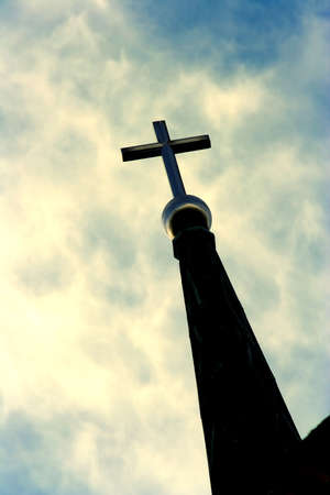 Church tower with a cross and a noisy cloudy sky