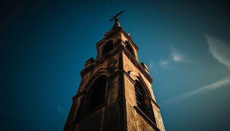 A majestic and ancient church tower standing tall against a clear blue sky created with Generative AI