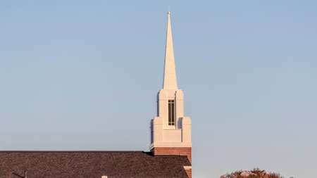 Panorama Gray roof and white steeple of church on winter view of snowy Wasatch Mountains. Vibrant blue sky and fluffy clouds can be seen in the bakcground.
