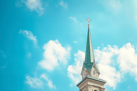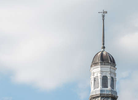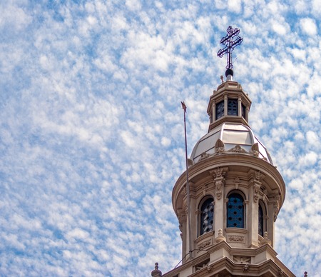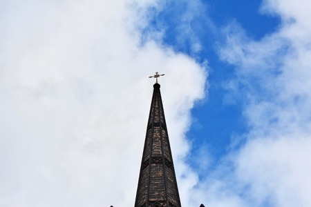 Church steeple against blue sky with white clouds. Religious background.
