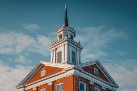A tall brick building with a prominent tower against a clear blue sky. The architectural style appears historical with white trim details. The image displays a symmetrical composition and natural lighting. Suitable for uses related to history, architecture, or general visual interest.