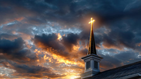 A majestic church steeple pierces a dramatic sky filled with fiery sunset clouds, creating a powerful and awe-inspiring scene.