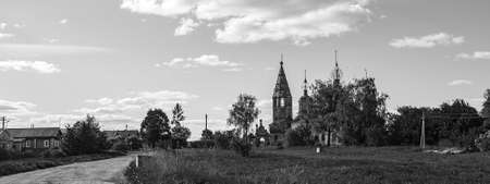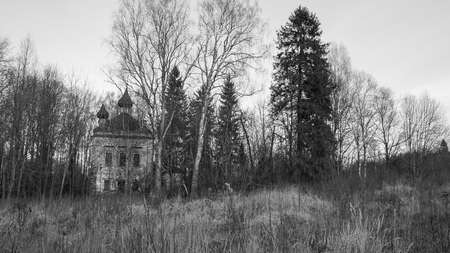 landscape, an old abandoned Orthodox church, the village of Ostrov, Kostroma province, Russia. The year of construction is 1782. Currently, the temple is abandoned.