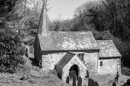 St. Cynog Churchyard in Defynnog, Powys, Wales, United Kingdom. Graveyard at a church in Black and white