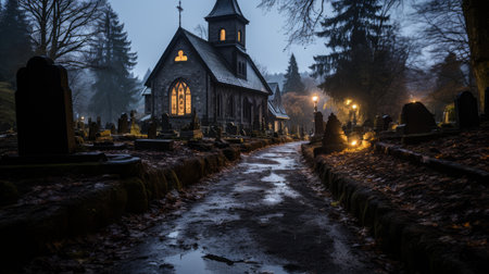 Golden light from the rising sun illuminates a cobblestone path leading to a chapel in a cemetery on a cold autumn morning