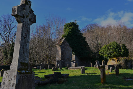 A view across an old cemetery toward a ruined church building in the rural hamlet of Clachan of Campsie in Scotland.