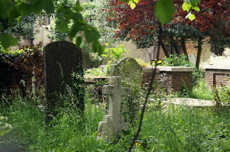 Old english cemetery in spring with green grass, bloomig flowers around and blue sky of sunny day. Many very old gravestones surrounded by beautiful nature