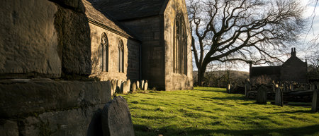 An old church stands beside a tranquil graveyard with sunlight casting long shadows over the grass and tombstones during the late afternoon.
