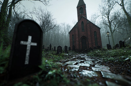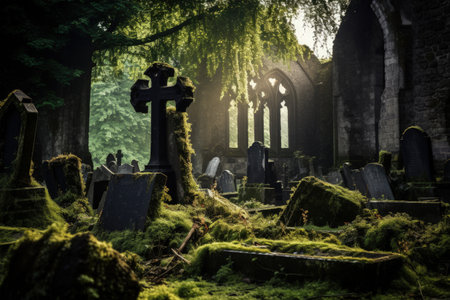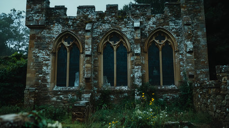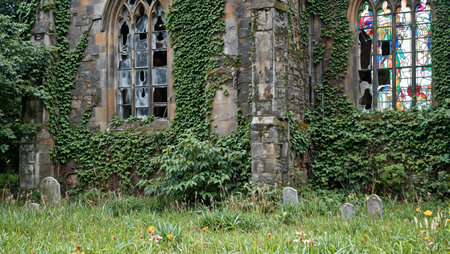Abandoned church with ivy cracked walls shattered stained glass and overgrown graveyard