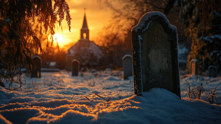 A solitary gravestone in a snowy cemetery, illuminated by the warm orange and yellow tones of a winter sunset, with a distant church.