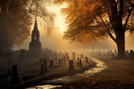 cemetery at dusk, with the sun setting over the horizon and a clear sky, created with generative ai