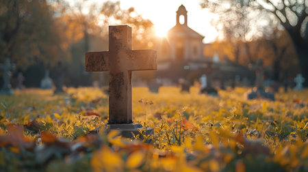 Serene catholic cemetery tranquil grave marker and cross amid softly blurred background
