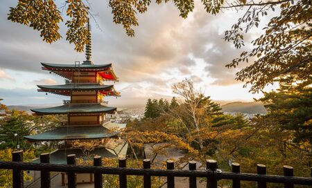 Chureito pagoda at sunset in autumn season on Mt.fuji background. Point view of Mt.Fuji at Kawaguchiko.