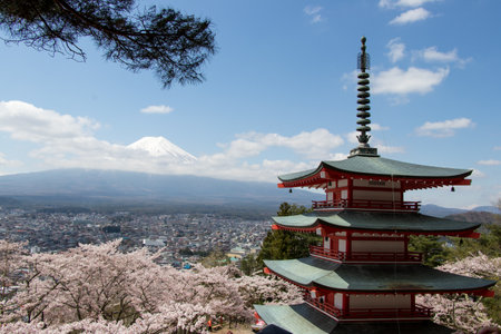 Mt. Fuji viewed from behind Chureito Pagoda or Red Pagoda with sakura in spring.