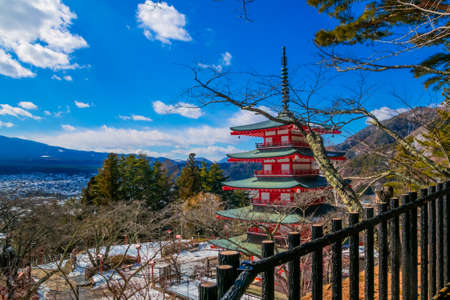 Mt. Fuji with red pagoda in winter, Fujiyoshida, Japan