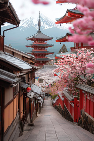 Majestic Mount Fuji, capped with snow, is seen from behind a vibrant cherry blossom tree and a stunning red pagoda in Japan. A picturesque view of the city and the iconic mountain.