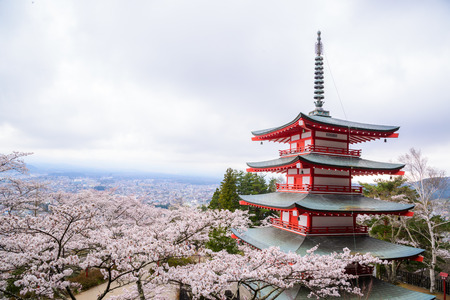 Chureito pagoda and cherry blossom as foreground and mount fuji as background, travel destination in japan