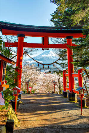 Japan - April 13, 2019 : Red Torii Gate with Fuji Mountain Background in Spring Sakura Festival at Chureito Pagoda, Japan