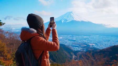 Young Woman Enjoying Scenic Train Ride with Picturesque Autumn View of Mount Fuji in Japan AI Generative