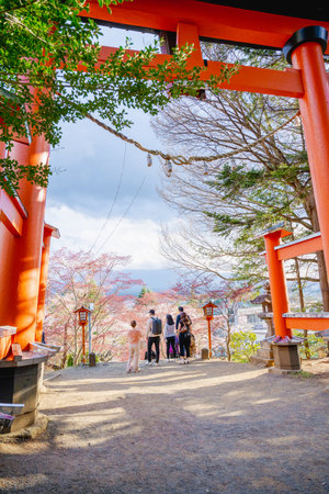 Shimoyoshida, Japan- 15 May 2024: Arakurayama Sengen Park Shrine Torii gate and Fuji Mountain at spring in Yamanashi, Japan
