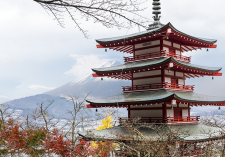 Beautiful landscape of mountain fuji with pagoda in autumn season at Yamanashi Japan