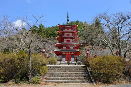 A close up view on iconic Chureito pagoda on a hilltop facing Mt. Fuji in Arakurayama Sengen Park, Japan. It can be reached via 398 steps. The pagoda has five stories and distinctive red color.