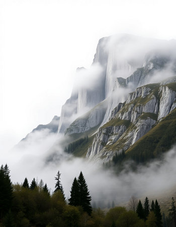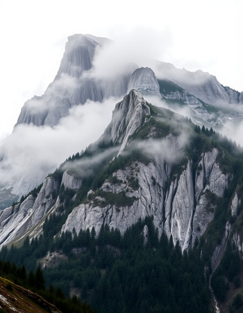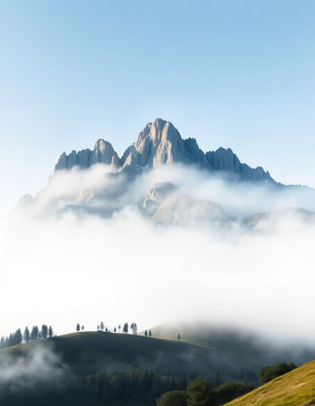 Foggy mountain landscape in the Dolomites, Italy.