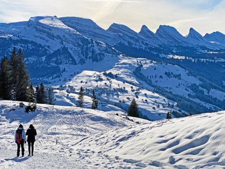 A view of the perfect winter landscape of the Thur river valley between the Churfirsten and Alpstein mountain ranges, Wildhaus - Canton of St. Gallen, Switzerland (Schweiz)
