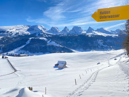 Hiking markings and orientation signs with signposts for navigating in the idyllic winter ambience on the Alpstein mountain massif and in the Swiss Alps - Alt St. Johann, Switzerland (Schweiz)