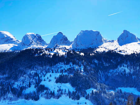 Snowy peaks of the Swiss alpine mountain range Churfirsten (Churfürsten or Churfuersten) in the Appenzell Alps massif - Alt St. Johann, Switzerland (Schweiz)