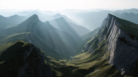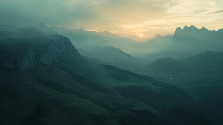Majestic mountain range shrouded in mist during a serene sunrise, with golden sunbeams piercing the clouds.