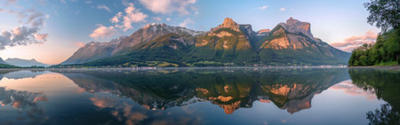 A panoramic view of a serene lake reflecting a majestic mountain range at sunrise. The calm water showcases a perfect mirror image of the peaks, creating a breathtaking landscape. The sky is a soft blend of pink and blue, illuminating the scene with a warm, golden glow.