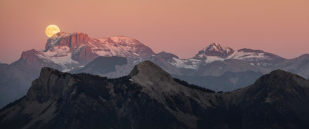 Panoramic view of the mountain range at sunset in the Alps