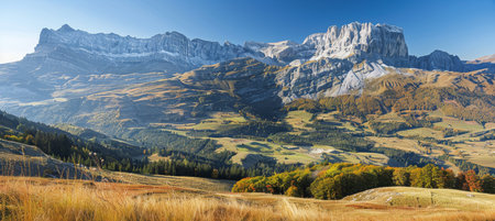 Majestic mountain landscape under a bright blue sky with lush green valleys and rocky peaks